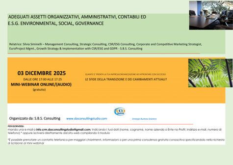 Il terzo mini-webinar espone molto brevemente ed in modo molto semplificato gli Adeguati Assetti Organizzativi, Amministrativi, Contabili e gli E.S.G. (Environmental, Social, Governance) Principi e Standard al fine di comprendere meglio il loro significato intrinseco e collegato, importante, fondamentale anche per le realtà più piccole e soprattutto per la loro sopravvivenza. Sono inoltre menzionati i Vantaggi e le Opportunità che le Imprese e le Organizzazioni no-profit/ETS possono ottenere.
